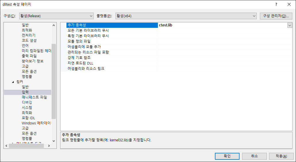 3. [프로젝트 속성 > 링커 > 입력]에서 추가 종속성에 lib파일 이름을 입력해줍니다.