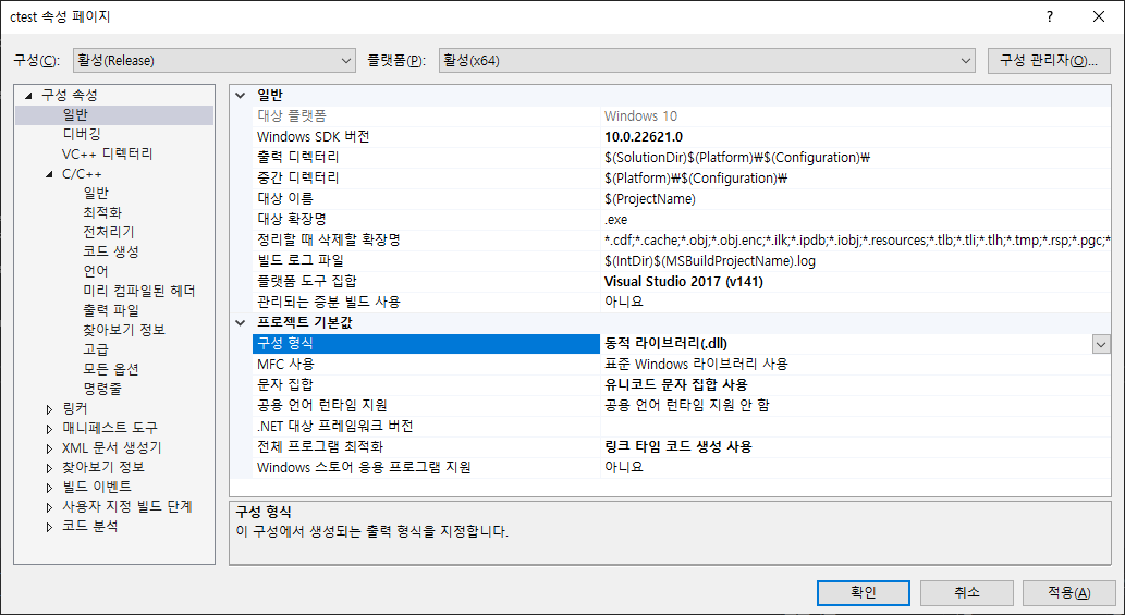 빌드하기전에 [프로젝트 속성 > 구성 속성 > 일반] 에서 구성 형식을 동적 라이브러리(.dll)인지 꼭 확인해야합니다.