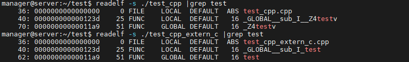readelf 명령어를 사용하여 확인해보면 실제로 C로 컴파일한 파일은 test 라는 이름으로 심볼이 생성되었고 C++로 컴파일한 파일은 _Z4testv 라는 이름으로 심볼이 생성된걸 확인할 수 있습니다.
